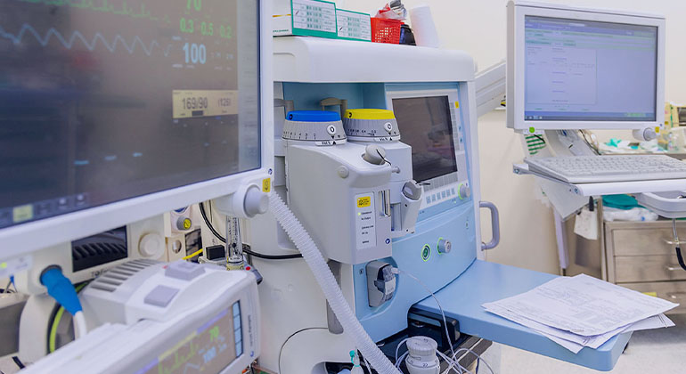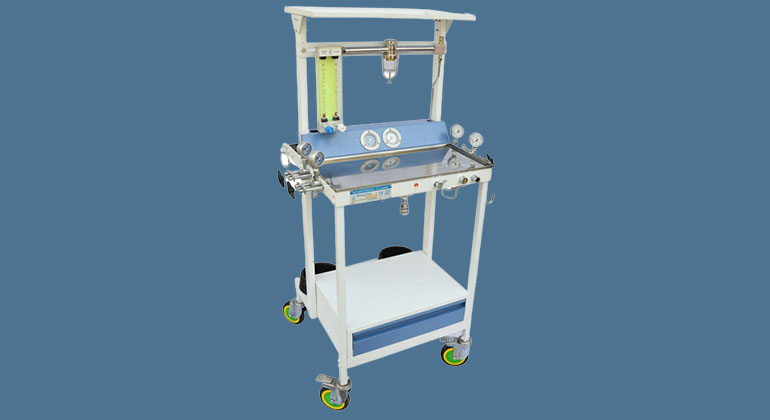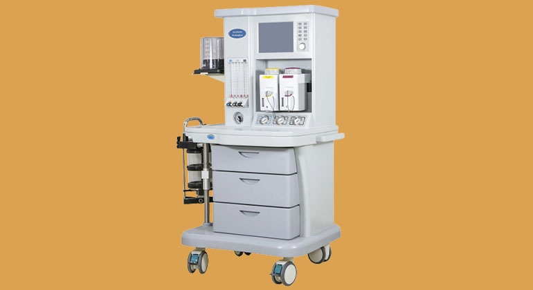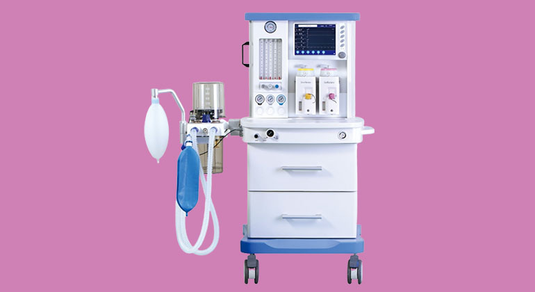 An anesthesia machine is a pneumatic device that supplies a mixture of oxygen, gas, and anesthetic agent to a patient, allowing them to remain unconscious, but breathing, during surgery.